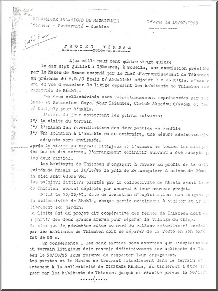 A Thiambène (30 kilomètres de Rosso), un conflit vieux de 1995, a refait surface (voir en fac similé). Un problème foncier avait surgi dans ce village et le droit aurait été dit en faveur des villageois, droit qui a cimenté leur appartenance sur ces terres.