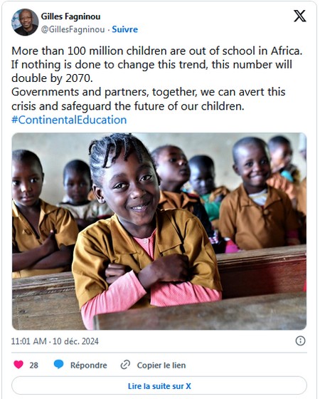 Gilles Fagninou, directeur régional Afrique de l’Ouest pour le Fonds des Nations unies pour l’enfance (Unicef), tire la sonnette d’alarme «en Afrique, 100 millions d’enfants en âge d’aller à l’école primaire et secondaire, ne sont pas scolarisés.