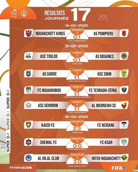 En clôture de la 17ème journée, l’Al-Hilal SC a pulvérisé l’Inter Nouakchott (3-0). Yasir Mozamil ouvrait le score (11'). Peu après (45+2'), Yasir Awad doublait la mise. Le sénégalais El Hadj Madické Kane pliait la rencontre (65'), face à des Intéristes dépassés qui ont fini la rencontre à neuf, suite aux expulsions de Mamadou Gangué et de Doudou Aliène (55’).